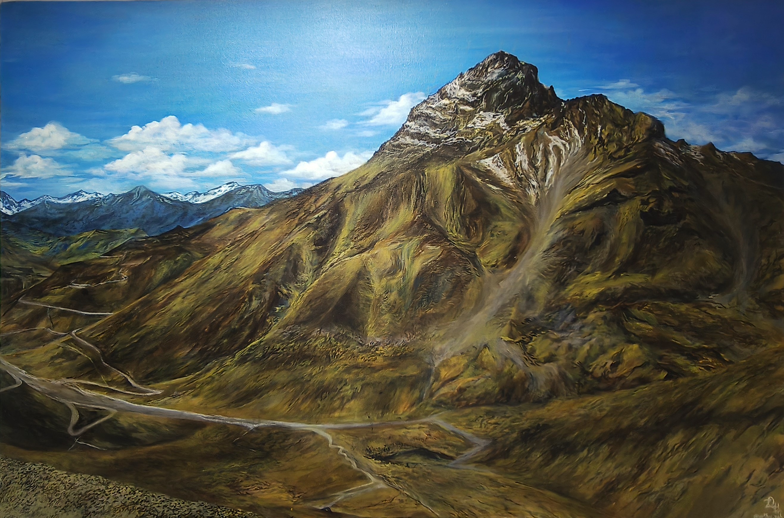 Artwork captures the raw, moon like majesty of Ladakh’s high altitude dessert near “Whisky Nala”. This piece celebrates the massive scale of the Himalayas and the tough spirit of travellers who ride them.