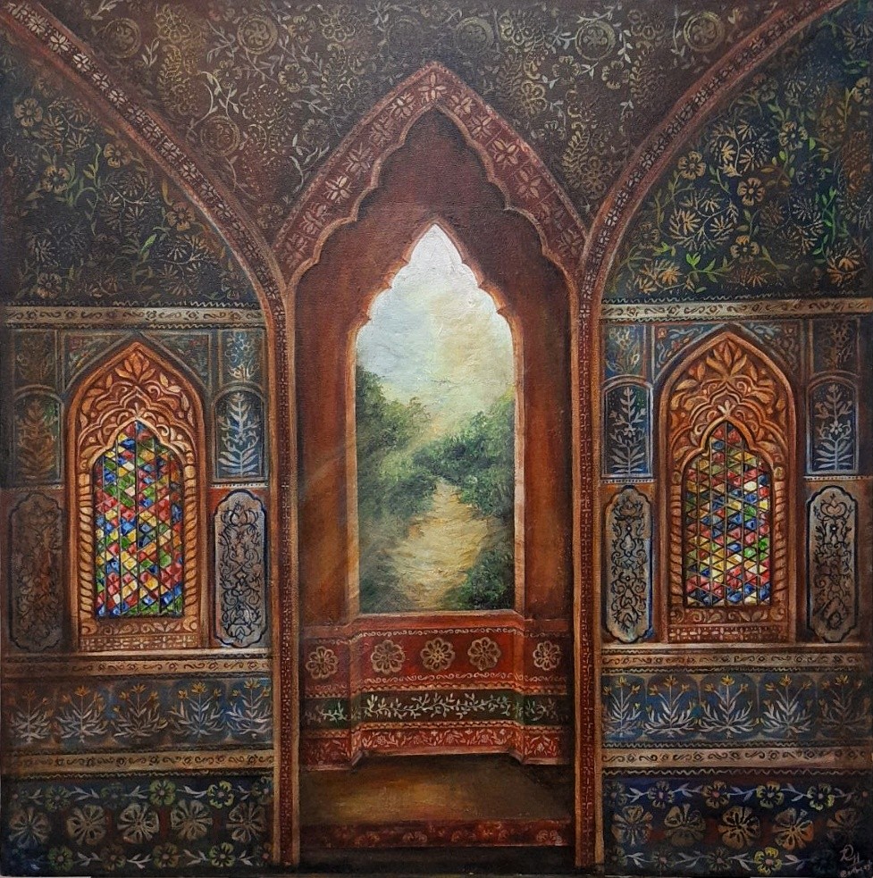 Artwork captures the beauty of “Rajasthani Jharokha's” with coloured pieces of glass and sunlight streaming through them. It focuses on the intricate architectural designs and the charm of traditional wall art.
