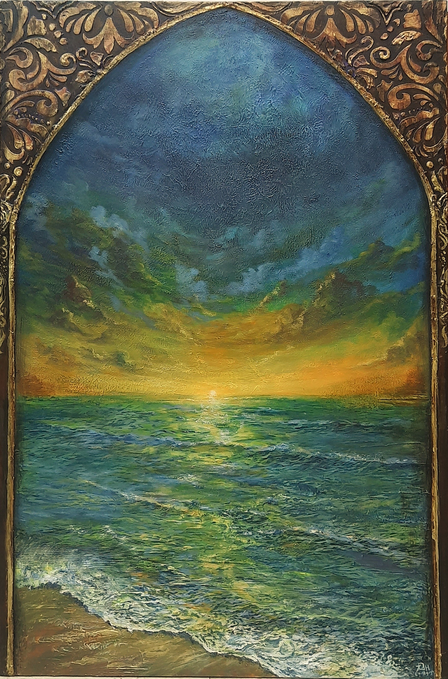 A highly textured artwork that represents a powerful sunset over the ocean, where the sky blends deep blue with a brilliant golden light which reflects across the water. The decorative archway acts as a door that immediately immerses the viewer through the magic hour.