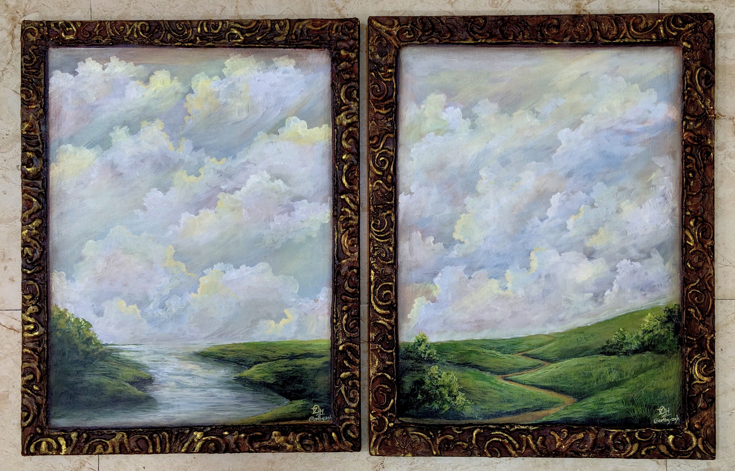 This paired artwork unfolds a tranquil landscape beneath a vast, cloud-filled sky. On one panel, a gentle river glides through rolling green banks; on the other, a winding path crosses soft hills, echoing the river’s quiet movement. Together, the two scenes feel like parallel journeys—water and earth sharing the same sky—inviting reflection, balance, and a sense of calm continuity.